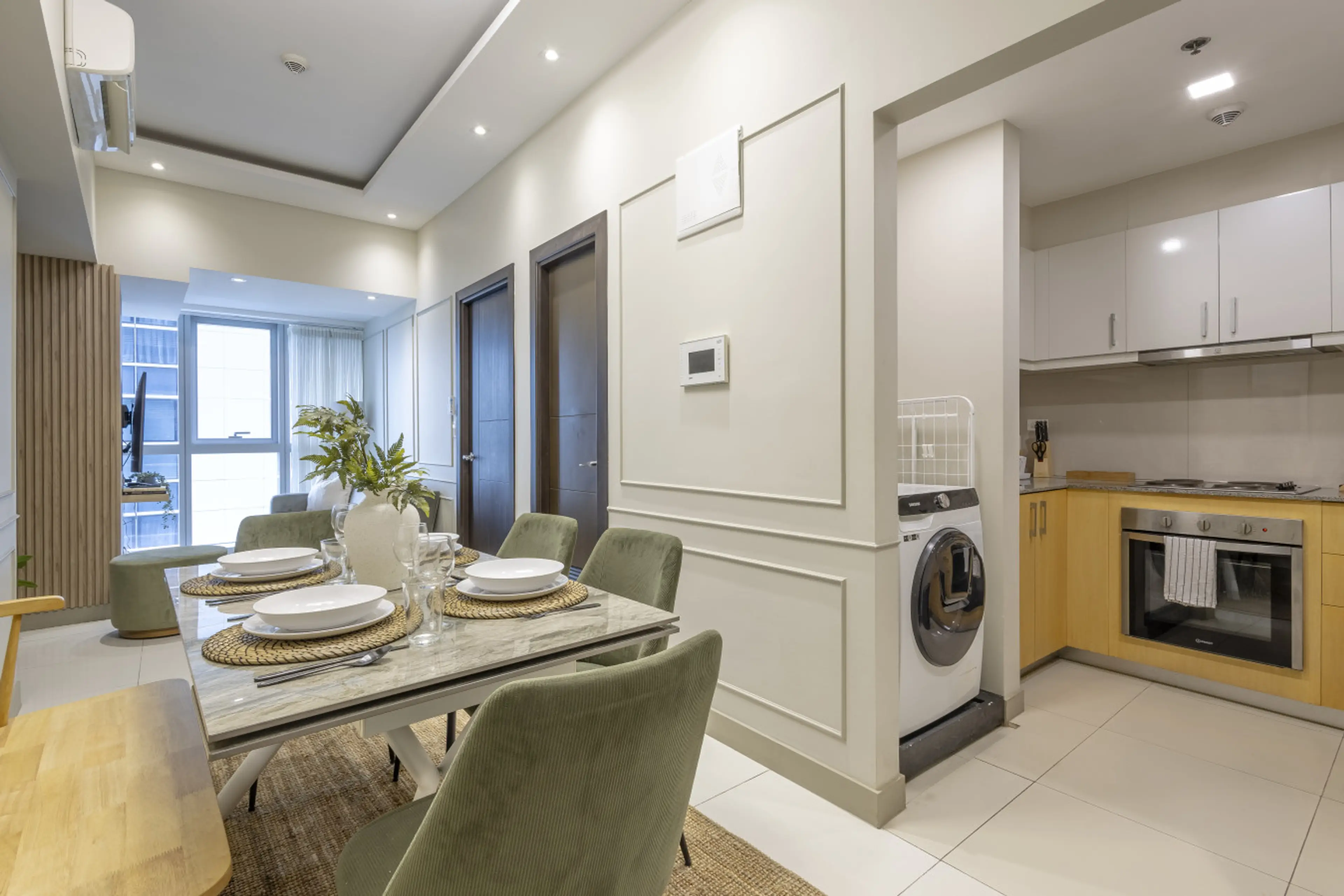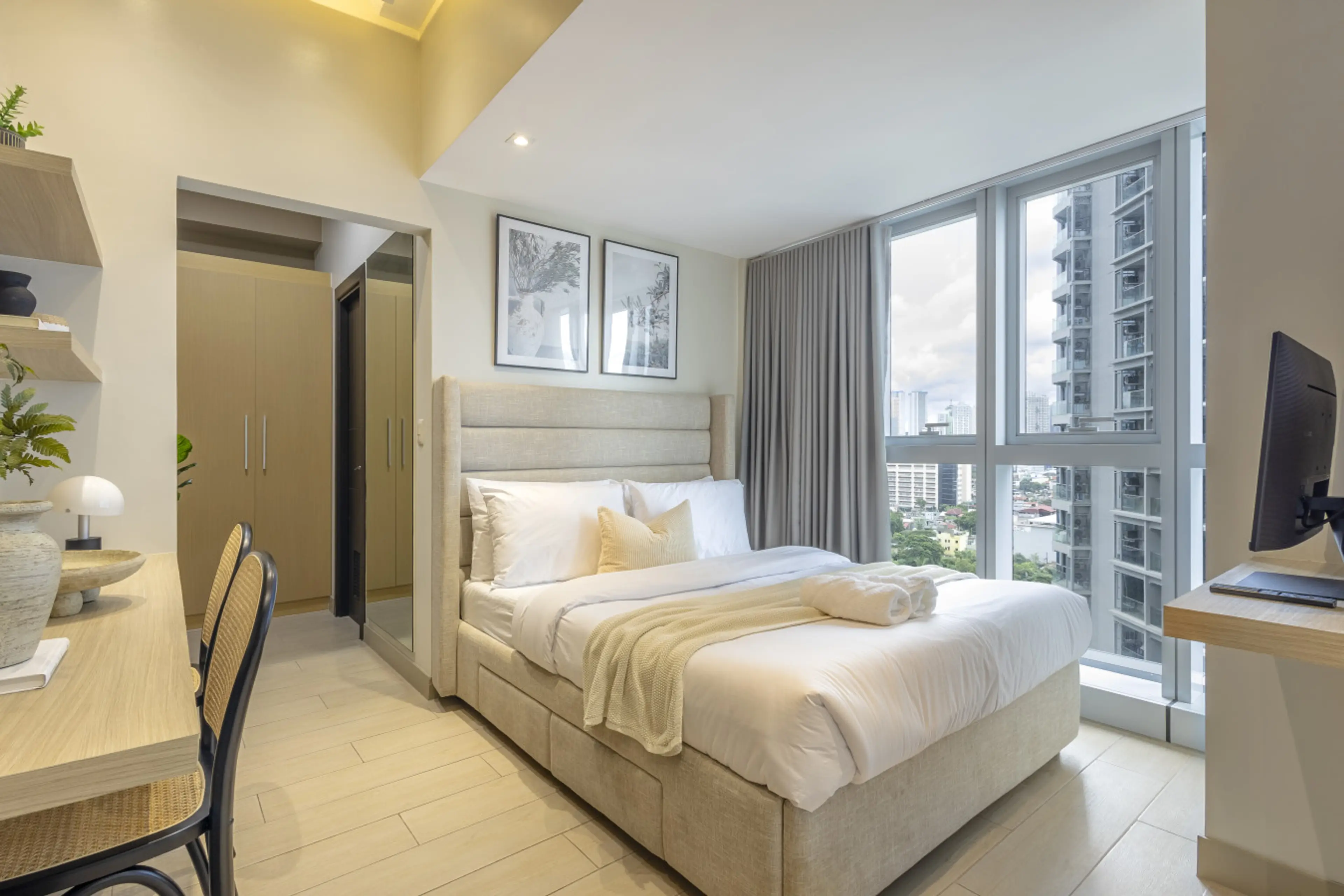 Stylish 2BR, 2BTH home in Uptown Parksuites, BGC—intimate, relaxing, with warm neutral tones. Enjoy city views, two pools & fast 500mbps WiFi with Netflix & cable on TV in the living & master. Each bedroom has a desk to work-from-home. A full kitchen with stovetop, oven, fridge & washer adds conveni...